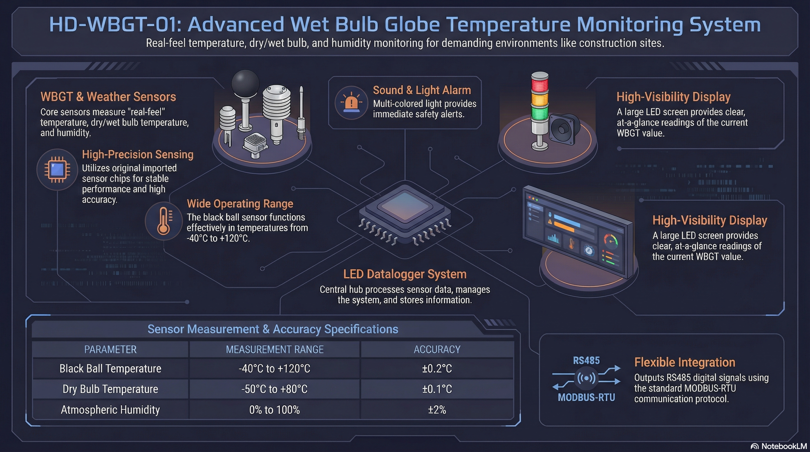 HD-WBGT-01 ਇੱਕ ਏਕੀਕ੍ਰਿਤ ਹੱਲ ਹੈ ਜੋ ਕਈ ਮੁੱਖ ਹਿੱਸਿਆਂ ਤੋਂ ਬਣਿਆ ਹੈ ਜੋ ਅਸਲ-ਸਮੇਂ ਦੇ ਵਾਤਾਵਰਣ ਡੇਟਾ ਅਤੇ ਚੇਤਾਵਨੀਆਂ ਪ੍ਰਦਾਨ ਕਰਨ ਲਈ ਇਕੱਠੇ ਕੰਮ ਕਰਦੇ ਹਨ।